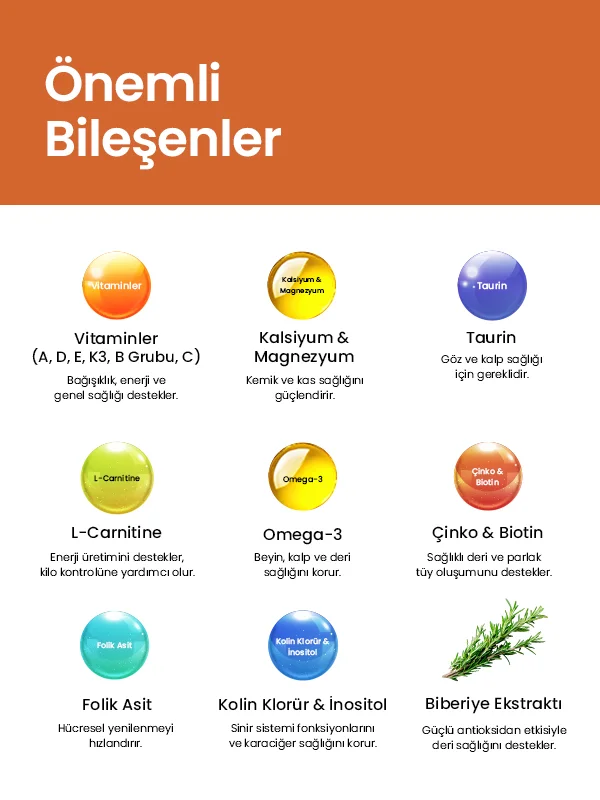 • Biotin, Kolin, İnositol, Folik Asit: Tüy kalitesi, karaciğer ve beyin fonksiyonlarına destek