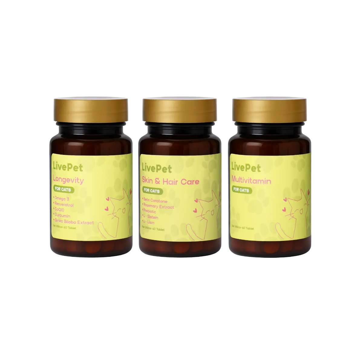 Kedinizin bağışıklığını, tüy ve cilt sağlığını aynı anda destekleyen 3’lü Vitamin ve Tüy Bakım Paketi– LivePet Tam Bakım Seti. Üstelik tek tek almaya göre çok daha avantajlı fiyat!
